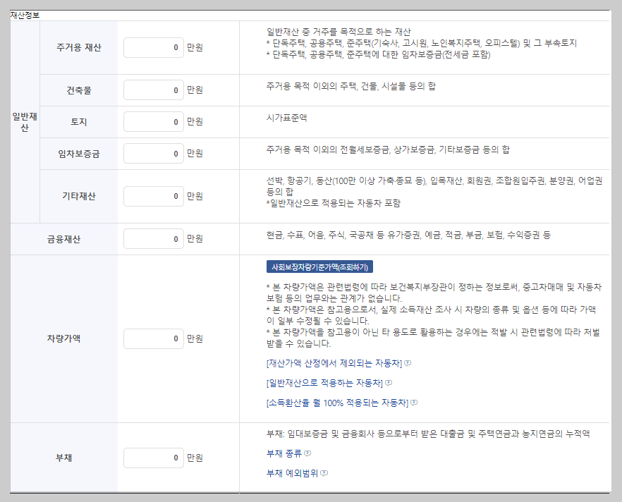소득인정액 계산은 소득평가액 + 재산의 소득환산입니다. 월급뿐만이 아닌 재산을 환산한 값을 더해야 소득인정액이 나옵니다. 다행인 점은 소득환산액에서 부채가 감액된다는 점입니다. 또한 기본재산액도 감액이 됩니다. 아래의 표를 보시면 자세하게 알 수 있습니다. 더욱 정확한 내용을 알고 싶으신 분은 복지로 홈페이지에 있는 모의계산을 활용하시면 됩니다.