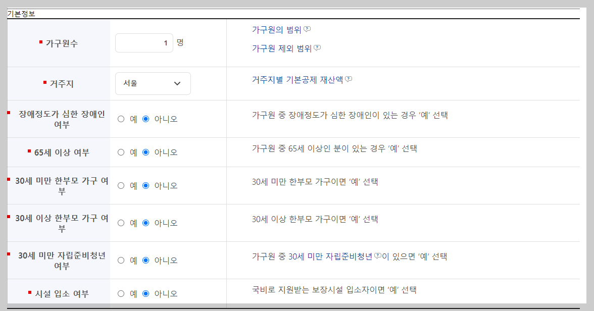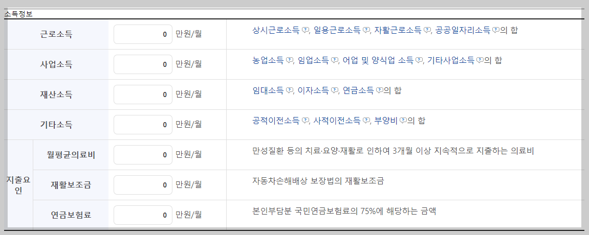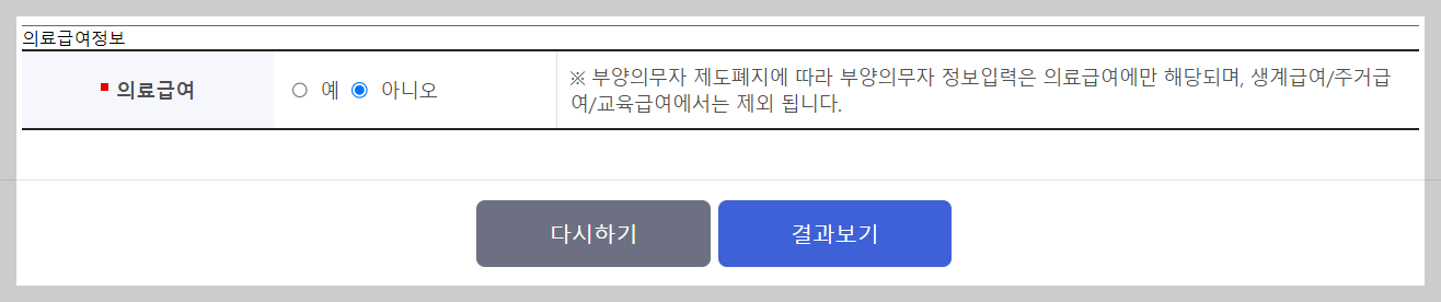 모의계산 페이지에서 기본정보, 소득정보, 재산정보, 의료급여정보를 입력하면 결과를 확인하실 수 있습니다.