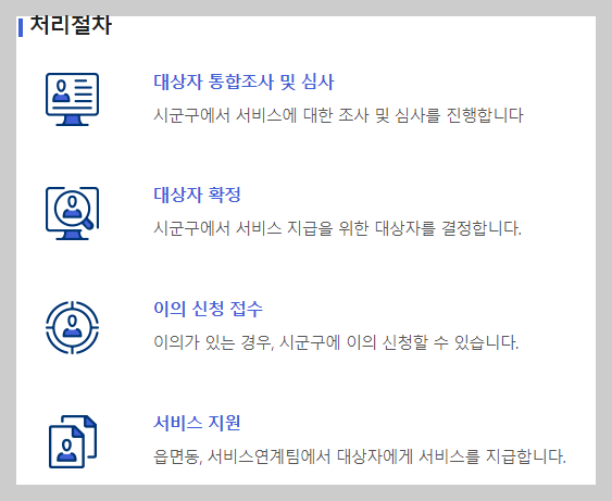 대상자 통합조사 및 심사를 진행한 후 대상자를 결정합니다. 이의가 있는 경우 시군구에 이의 신청을 하며, 대상자로 확정된 분들에게는 서비스가 지원됩니다.
